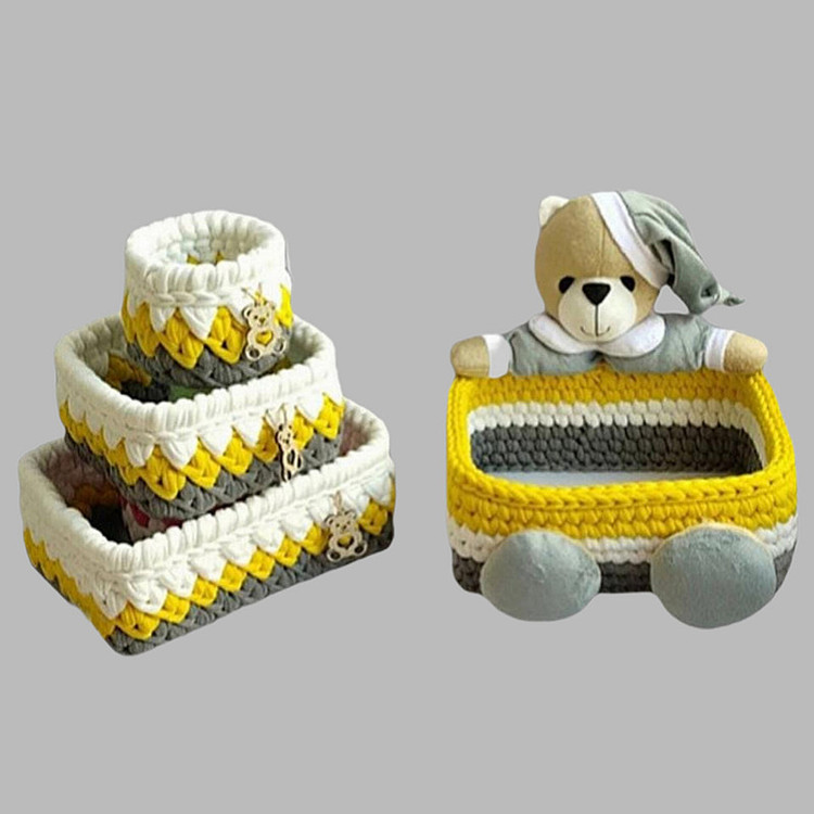 سبد 4 تایی قلاب بافی تریکو مناسب نوزاد ،کودک و بزرگسال میباشد .مناسب نظم بندی لوازم بهداستی و ارایشی است .با بافت محکم و ابعاد مناسب میباشد .ابعاد کار 2 عدد مستطیل 25 در 15 و مربع 15 و دایره 10 سانتیمتری میباشد.