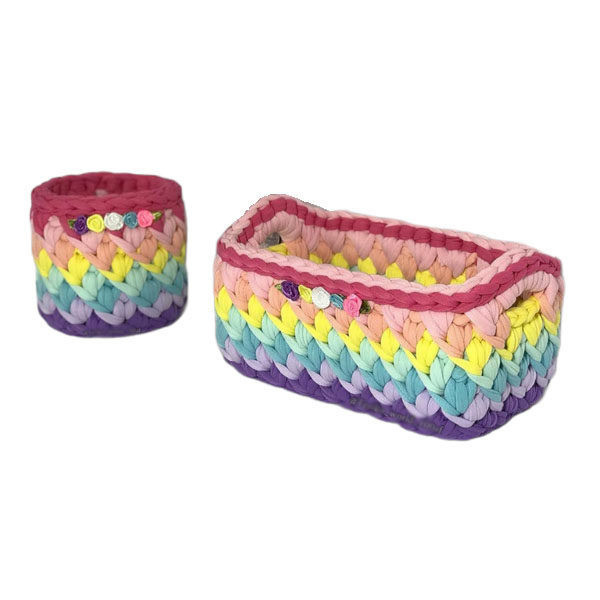 سبد 2 عددی رنگارنگ مناسب مرتب کردن لوازم آشپزخانه و سایر وسایل خانه است.. جنس کفی از چوب ام دی اف میباشد. ابعاد کار مستطیل 25 در 15 و دایره 10 سانتیمتر میباشد. استقامت کار بالا و نخ ان بسیار باکیفیت است.