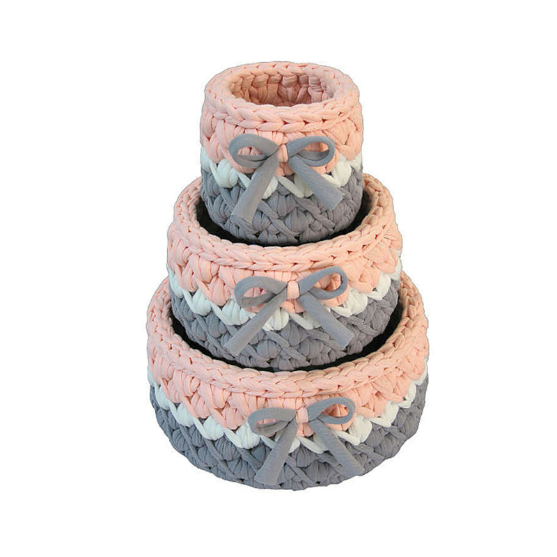 سبد قلاب بافی تریکو مجموعه 3 عددی میباشد .کیفیت بافت بالا بوده ، دیواره کار محکم و با استقامت و رنگبندی زیبایی دارد .ابعاد کار 20و 15 و 10 سانتیمتر میباشد.