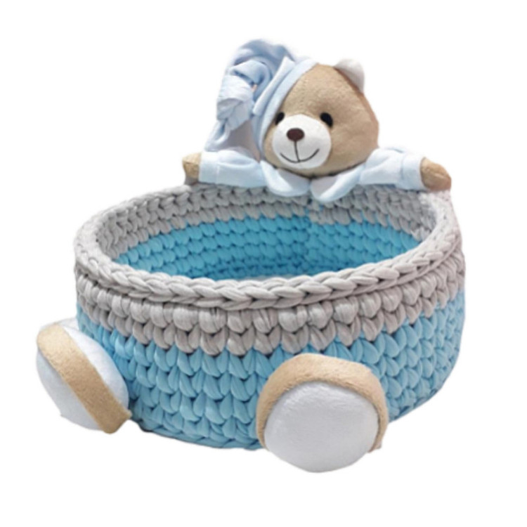 مجموعه ارائه شده شامل یک سبد میباشد که با بافت قلاب بافی از نخ تریکو پارچه ای تهیه شده است .در ابعاد 20 سانت میباشد و مناسب نظم دهی اتاق خواب و اتاق کودک و لوازم زینتی و بهداشتی میباشد.